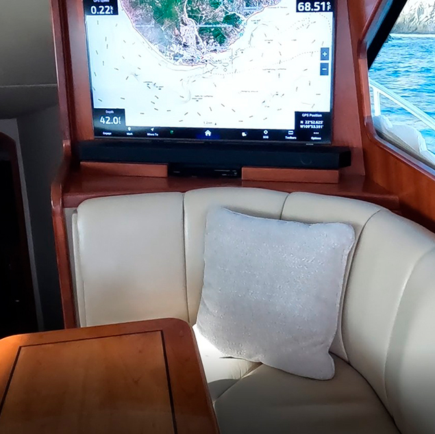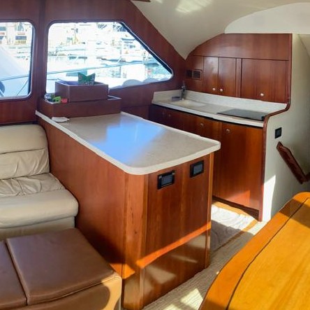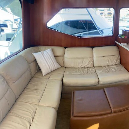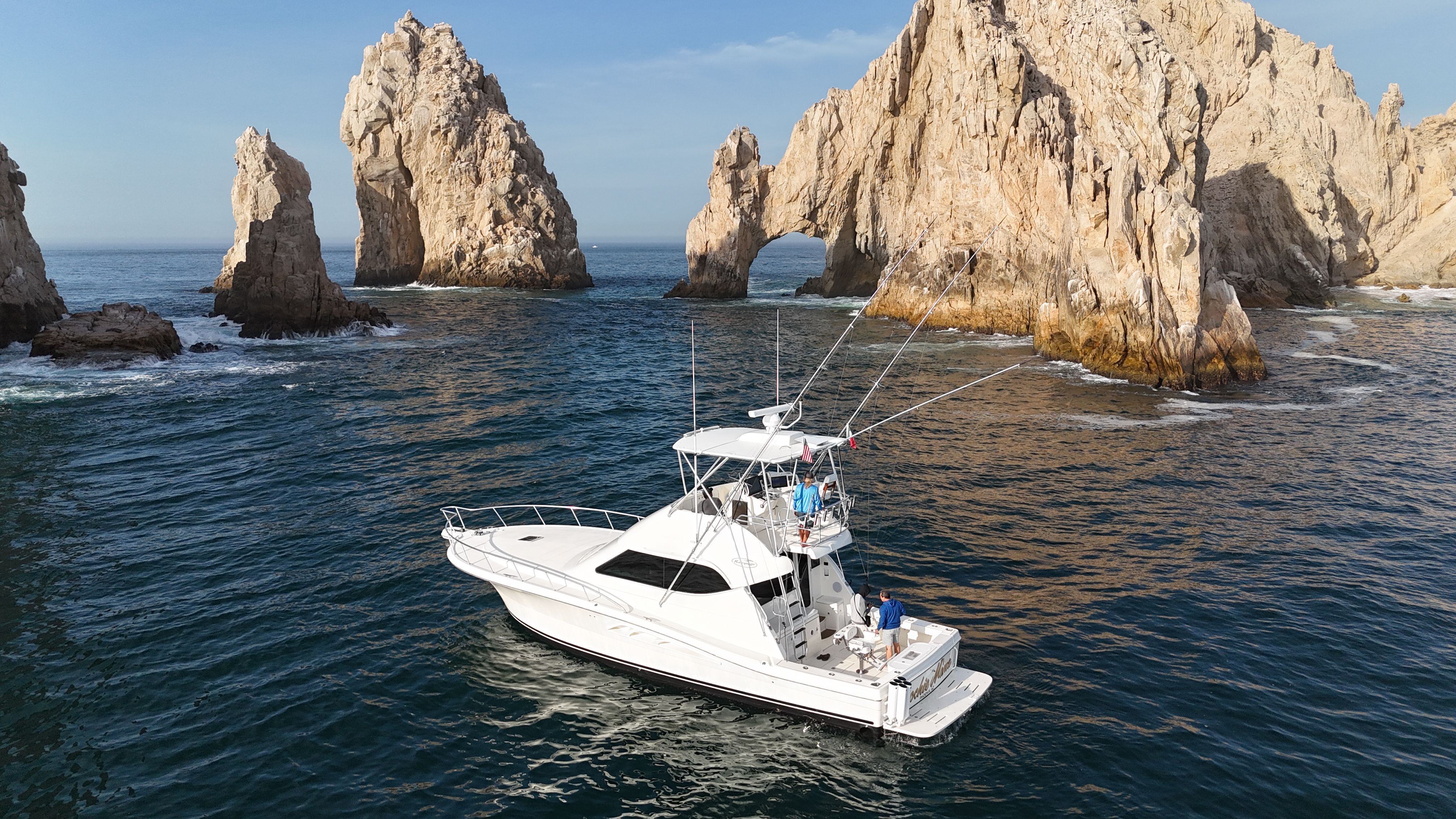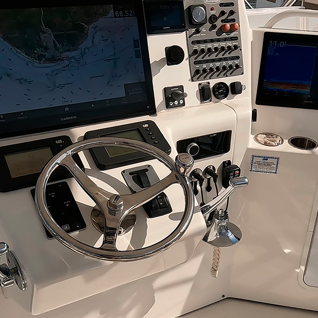 Inside, you'll find a stylish air-conditioned salon, private cabins, a fully equipped galley kitchen, a marine head, and all the space you need to relax after a day offshore. It's powered by high-performance inboard engines and outfitted with GPS navigation, radar, VHF, professional fishfinder, quiet generator, and a livewell for bait.